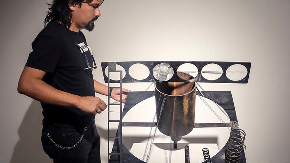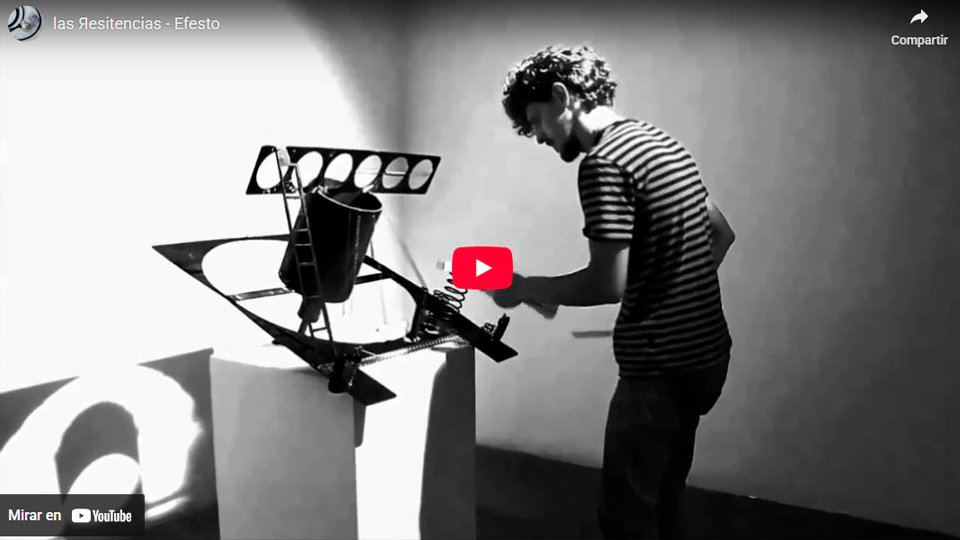 Además de evocar el sonido que producía Efesto en su taller, viene a nosotros la imagen de Einstürzende Neubauten golpeando metales en una bodega en la Alemania de 1985, o más recientemente Margaret Chardiet y su proyecto Pharmakon dando golpes a su lata hasta el éxtasis. Amantes del ruido, la luthería experimental y la materialidad del sonido hemos construido un artefacto que funciona como escultura y como instrumento para nuestros performances, le hemos llamado Efesto; Dios del fuego, los metales y escultores. Unas estructuras de acero ensamblada con soldadura a la cual hemos agregado resortes de diferentes dimensiones para tocar con las manos, varillas de meta, baquetas, rines de bicicleta o lo que queramos. Soportado sobre un rudo trípode de topografía o tirado en el suelo -así no más- Efesto permite que una o varias personas se unan al ritual del sonido con metales.