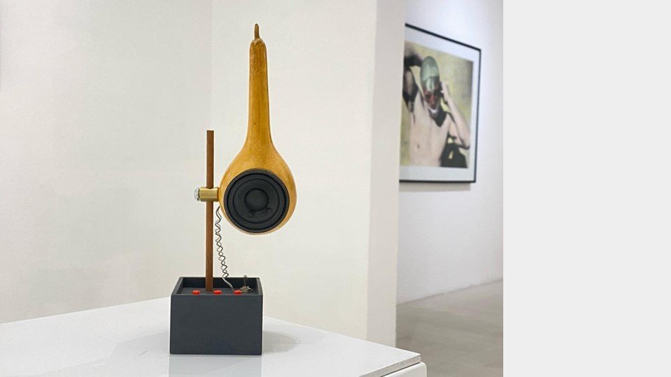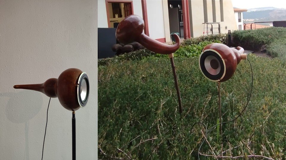 Escultura sonora: Madera, calabaza (Lagenaria siceraria) componentes de electrónica análoga, paisajes sonoros y composiciones con ocarinas, cuencos tibetanos e hidrófonos en loop de 15 minutos en cada pieza aprox.